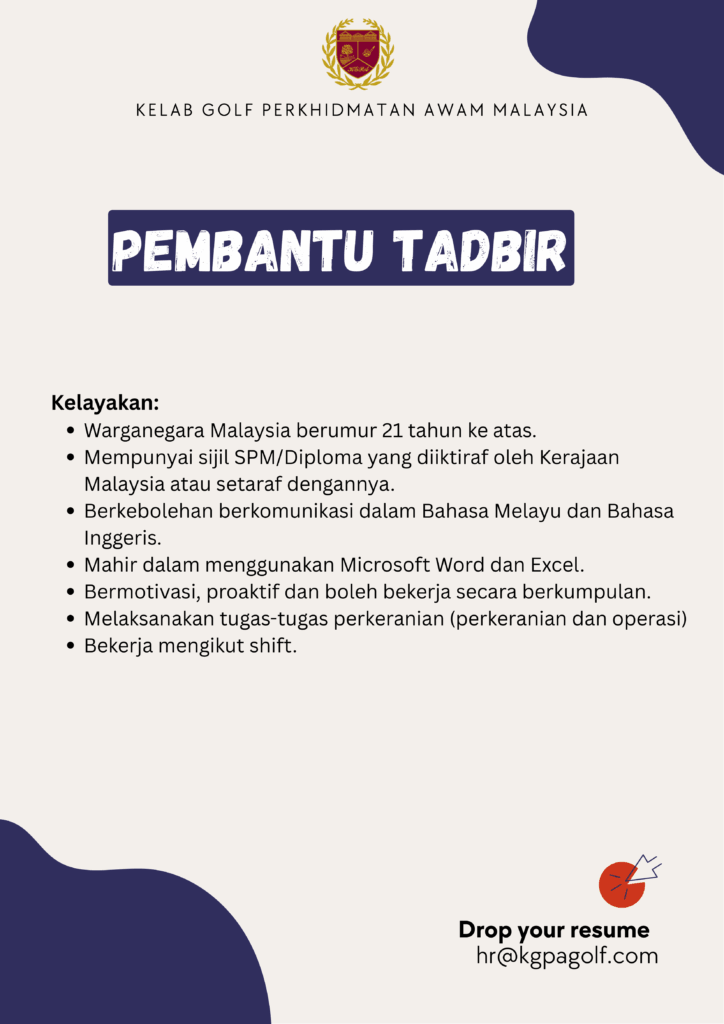 KGPA mempelawa permohonan untuk mengisi jawatan kosong sebagai PEMBANTU TADBIR. Calon-calon yang berminat boleh menghantar resume lengkap ke alamat emel: hr@kgpagolf.com