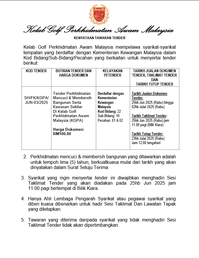 Sebutharga Kerja-Kerja Membekal Dan Menyelenggara Kelengkapan Kebersihanan (Hygiene) Tandas Di Kelab Golf Perkhidmatan Awam Malaysia