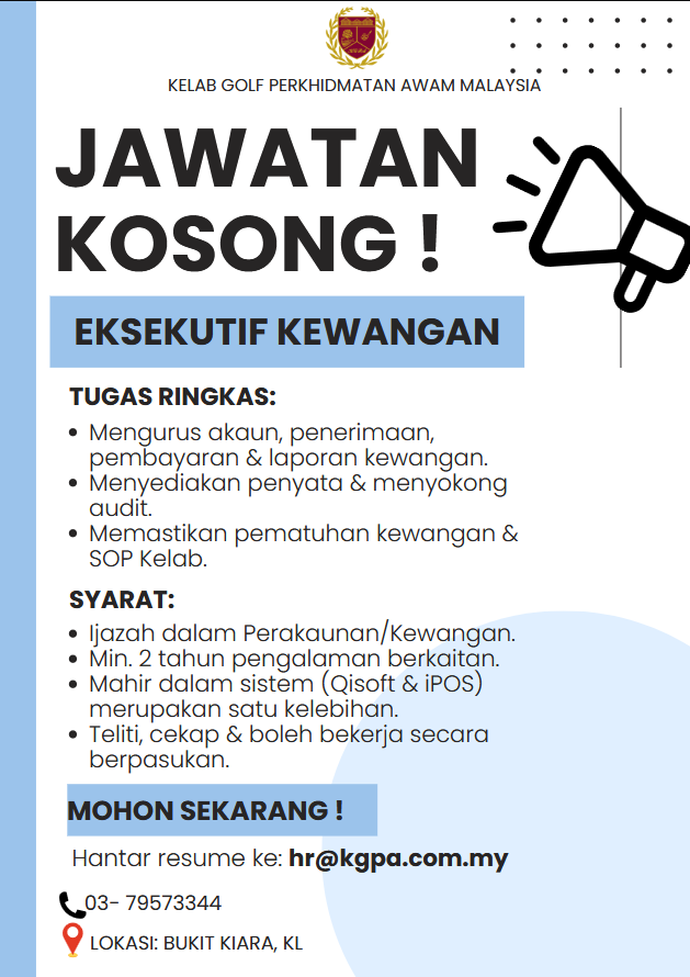 📢 JAWATAN KOSONG @ KGPA!EKSEKUTIF KEWANGAN📍 Lokasi: Bukit Kiara, KLKami sedang mencari calon yang berkelayakan dan komited untuk menyertai pasukan kewangan kami di Kelab Golf Perkhidmatan Awam (KGPA).🧾 Tugas Ringkas:• Mengurus akaun, pembayaran & laporan kewangan• Menyediakan penyata & menyokong audit• Memastikan pematuhan kewangan & SOP kelab🎓 Syarat:• Ijazah dalam Perakaunan/Kewangan• Min. 2 tahun pengalaman …