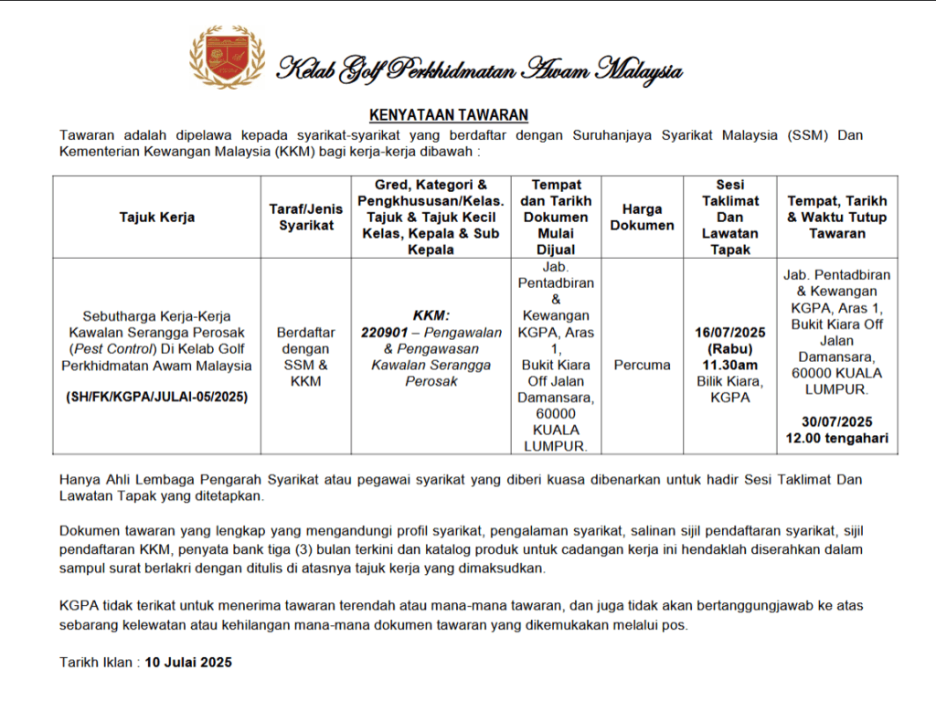 SEBUTHARGA KERJA-KERJA KAWALAN SERANGGA PEROSAK (PEST CONTROL) DI KELAB GOLF PERKHIDMATAN AWAM MALAYSIA