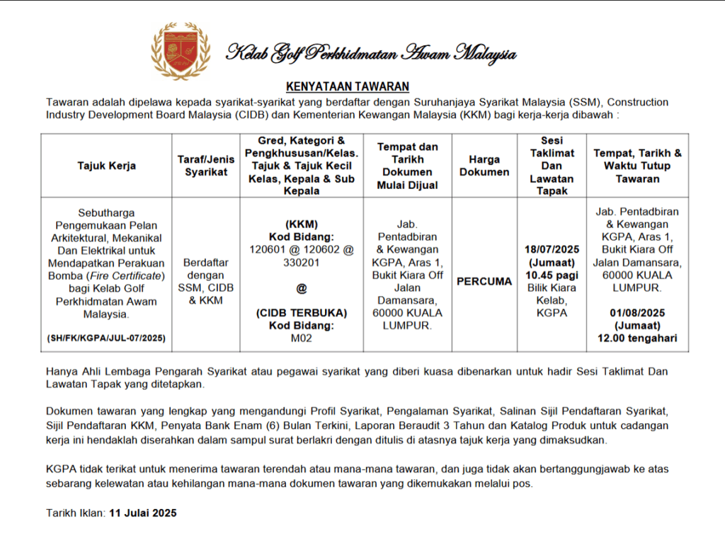 SEBUTHARGA PENGEMUKAAN PELAN ARKITEKTURAL, MEKANIKAL DAN ELEKTRIKAL UNTUK MENDAPATKAN PERAKUAN BOMBA (FIRE CERTIFICATE) BAGI KELAB GOLF PERKHIDMATAN AWAM MALAYSIA