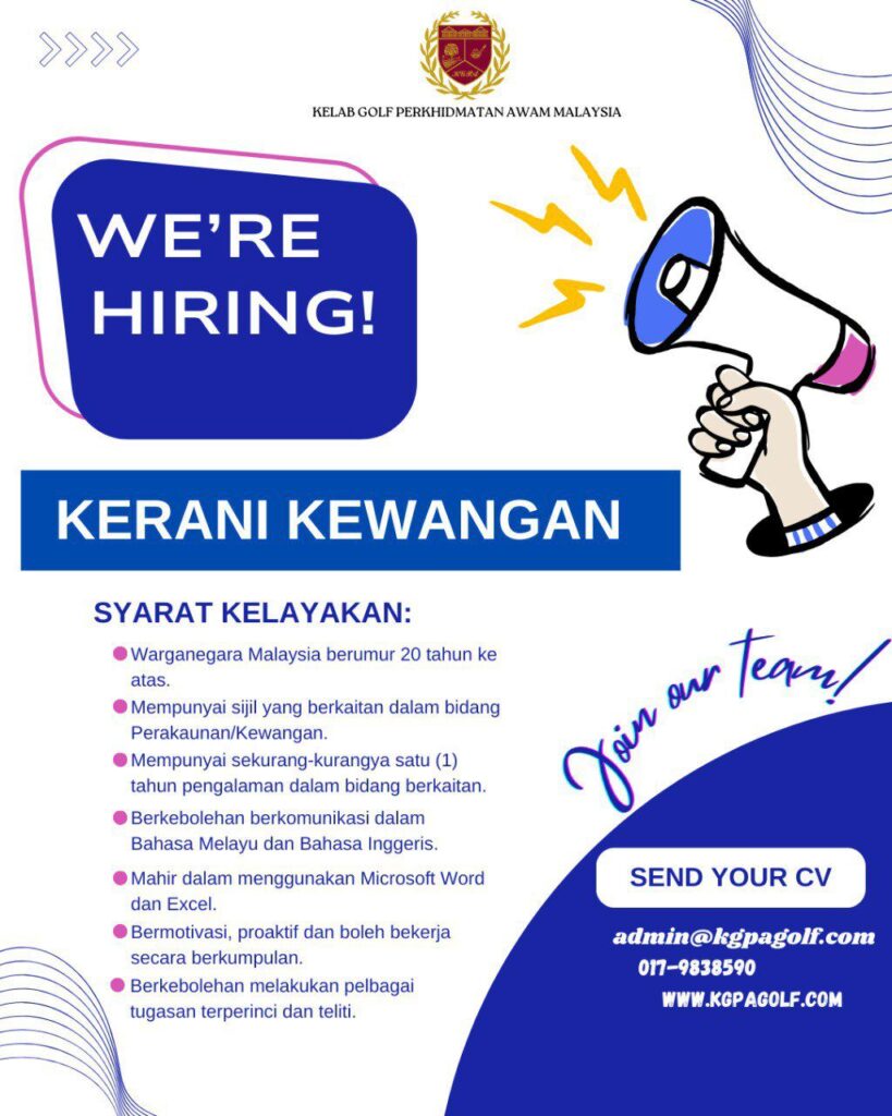 IKLAN JAWATAN KOSONGKelab Golf Perkhidmatan Awam (KGPA) KERANI KEWANGAN 📍Lokasi: Bukit Kiara, KL 🎓Kelayakan & Syarat: ✔️Warganegara Malaysia berumur 20 tahun ke atas.✔️Mempunyai sijil yang berkaitan dalam bidang Perakaunan / Kewangan.✔️Mempunyai sekurang-kurangnya satu (1) tahun pengalaman di dalam bidang berkaitan.✔️Berkebolehan berkomunikasi dalam Bahasa Melayu dan Bahasa Inggeris.✔️Mahir dalam menggunakan Microsoft Word dan Excel.✔️Bermotivasi, proaktif dan …