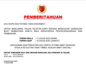 AHLI KGPA DAN TETAMU YANG DIHORMATI, UNTUK MAKLUMAN, TALIAN TELEFON KGPA SEDANG MENGALAMI GANGGUAN BUAT SEMENTARA WAKTU BAGI KERJA-KERJA PENYELENGGARAAN